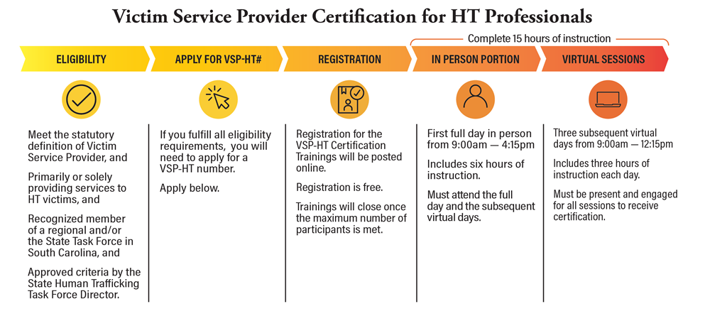 If you do not already have a VSP number (which would be changed to a VSP-HT number after completion of the training), you will need to apply for a VSP-HT number:Crime Victim Services Training, Provider Certification and Statistical Analysis - South Carolina Attorney General (scag.gov)